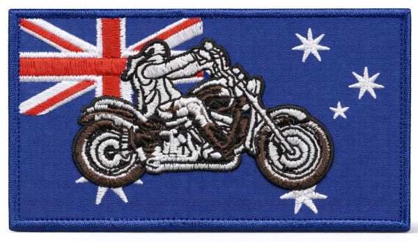 Australian Flag With Biker 10 x 5.75cm Quality Embroidered Patch with Heat Seal Backing.