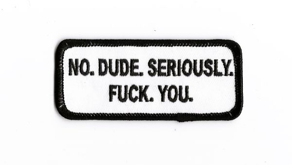 No Dude Seriously. FUCK. YOU. 9 x 4cm Quality Embroidered Patch with Heat Seal Backing.